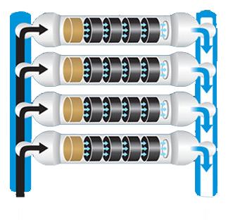 WATER flows in from main, splits into 4 tubes, increasing the time water is purified